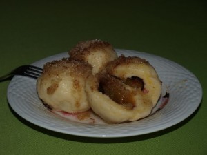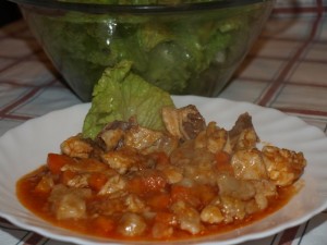 Piščančja omaka, ščipanci, zelena solata, slivovi cmoki:
