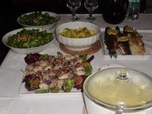 Gobova juhica; rdeče zelje, krompir v kosih, pečene ribe, kalamari in klapavice z veliko česna in peteršilja; motovilec s čičeriko: