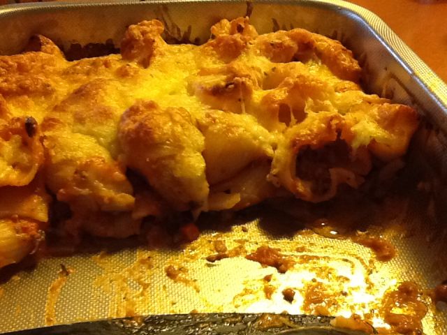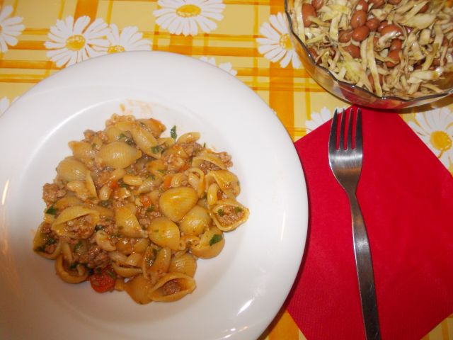 Danes pri nas goveje-kokošja juha s fritati, velike školjkaste testenine (lumaconi) z mesno paradižnikovo omako in sirom v pečici, mešana solata