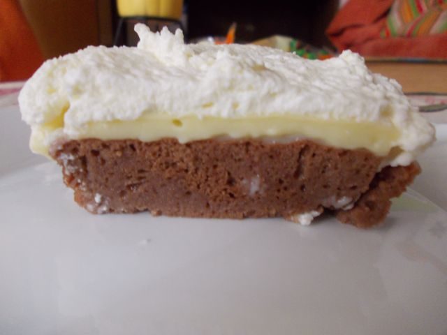 3 jajca, 9 žl. mleka, 6 žl. olja, 6 žl. sladkorja, 9 žl. moke, 3 žl. kakava in pol pecilnega praška (olje in sladkor sem zmanjšala za 3 žlice). Iz beljakov naredim sneg, potem pa skupaj zmešam. Polijem s 4 dl mleka, 4 žl. sladkorja in 7 žl. ruma. Polijem z 1 vanilijevim pudingom (pekač 30x17 cm).