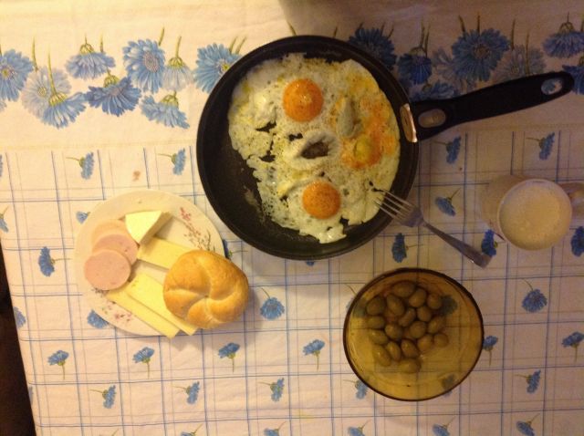 Mi smo danes imeli domačo pico, 100% pirino testo in malo 'okranclan' klasični nadev (sir, šunka, gobe, mocarela, kapre in domače olive), poleg pa pisano solato iz radiča, mlade špinače, motovilca, krompirja, fižola, koruze in trdo kuhanega jajca.