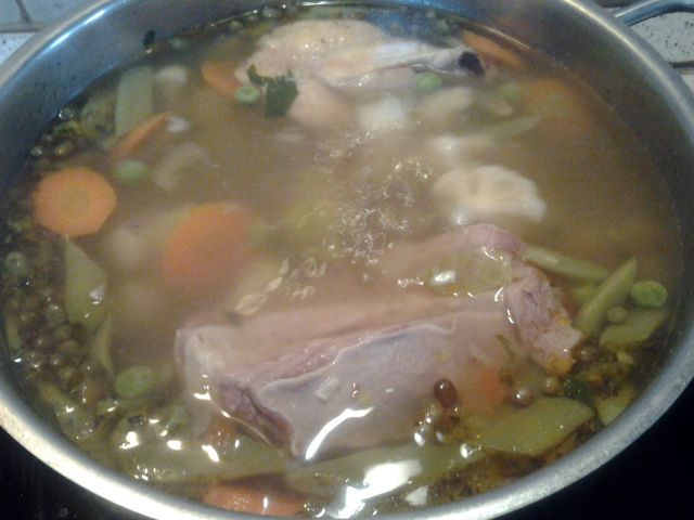 Danes zelenjavna juha in kos telečjih reber in perutka, zelena leča, domač kruh, paradižnikova solata s papriko, pečene hrenovke, meso.