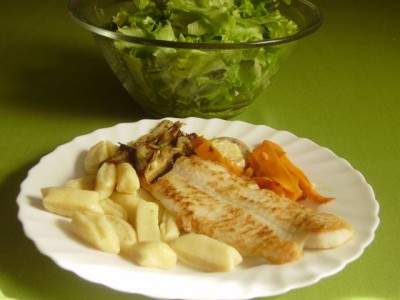 feta sirom, ribji file; zelena solata: