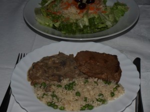 Goveja juhica (od včeraj); riž z grahom, jurčki in šampinjoni v omaki, goveji zrezki; mešana solata; jabolčni zavitek