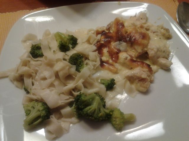 Danes dan ustvarjanja: trakci piščančka z lisičkami v smetanovi omaki s sirom, brokoli s pirinimi rezanci( jih kuham kar v enem loncu), motovilec