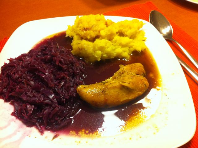V ponedeljek: midve s hčerko zelje in piščanec, mož pa kotlet in le pražen krompir, ker ne mara rdečega zelja, si pa je dodal hren v tubi.