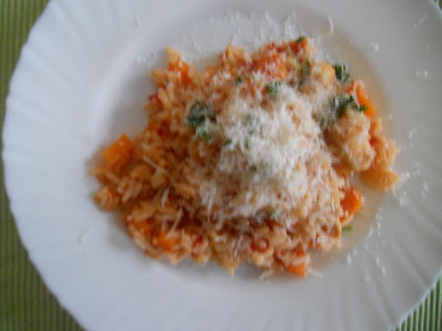 - KusZelenjavnaRižota (gobice, korenje, paprika, grah, čebula, por...) + pol male puranje hrenovčke