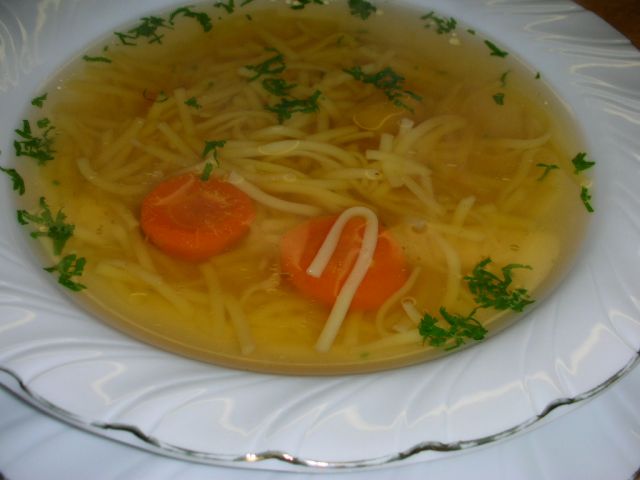 Goveja juha z rezanci, restan krompir, meso iz juhe, solata, zdele pa še metina