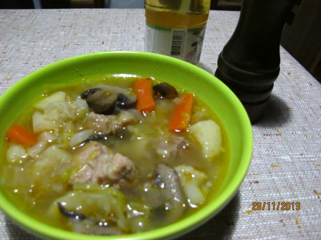 Kos svinjine ( ki ga je treba porabit ), kakšni zrezki : prepovedano, lahko skuham, pol naj bo svinjska obara. Narežem meso na kocke in v posodo, jušna zelenjava, košček cvetače gre zraven, nakockam krompir, dodam zraven, kos zelja ( ki ga je treba porabit ) pa lepo zgosti obaro in je po okusu neutralno, gre zravn.......... uf, uf treba bo zamenjat posodo, je premejhna, nekaj gob ( ki jih je treba porabit, zalijem z vodo, ( seveda, začimbe po okusu ) in kosilo ( tako, dietalno ) je ( čez eno uro ) kuhano.