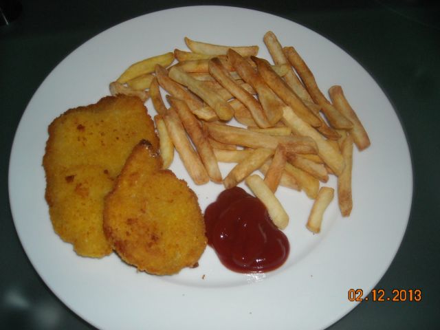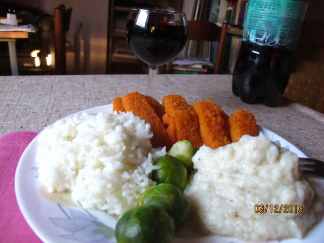 Danes grem mim vaškeg ribnika, pa ni bilo kaj prida. Kupim zmrznjene " fish fingers ", da tudi to poskusim. Kaže, da se slabo spoznam na ribjo anatomijo: nikakor namreč ne morem ugotovit, kateri del ribe naj bi to bil. Ugotovim, da nisem nič zamudil, ko prej nisem poskusil tistih prstov. zravn je riž in pire od cvetače, pa nekaj brokolijev ( zaradi kompozicije slike ). |