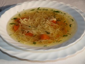 Kjer je volja, tam je pot. TrixiKurja juha, tagliete z rakci in stročjim grahom, solata.