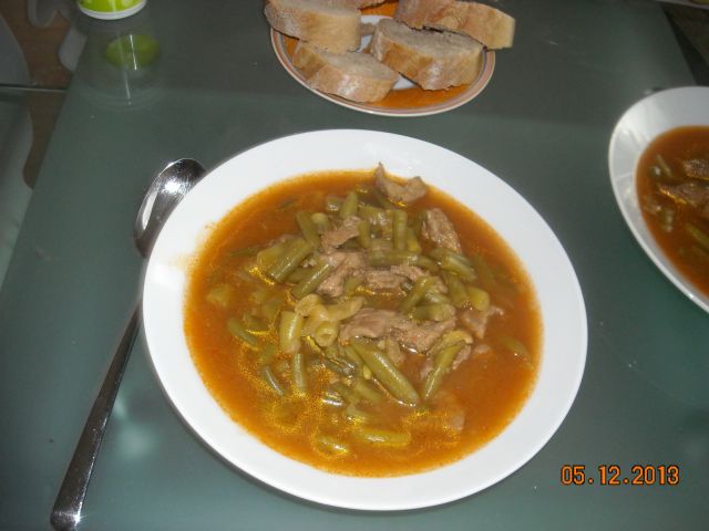 Goveja juha z zdrobovimi cmoki, mesna omaka in makaroni, paradižnikova solata. Zase sem naredila zvitke iz riževega testa polnjene z zelenjavo in gamberi v čilijevi sladki omaki.