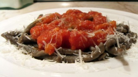 in domače ajdove testenine (brez jajc) z omako Amatriciana