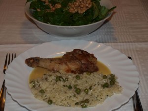 z jabolko nadevano piščančje bedro (pečeno v vrečki), pomarančna omaka, rizi-bizi; motovilec s sojo
