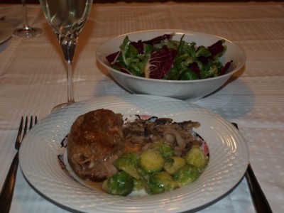 S sirom in pršutom nadevan telečji zrezek; jurčki na česnu, brstični ohrovt pravtako na česnu; motovilec z radičem;