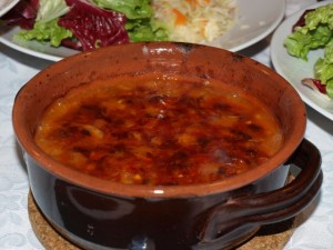 Juhica iz govejega repka; nadevana in pečena purica, mlinci, prebranac; mešana solata; pecivoo,