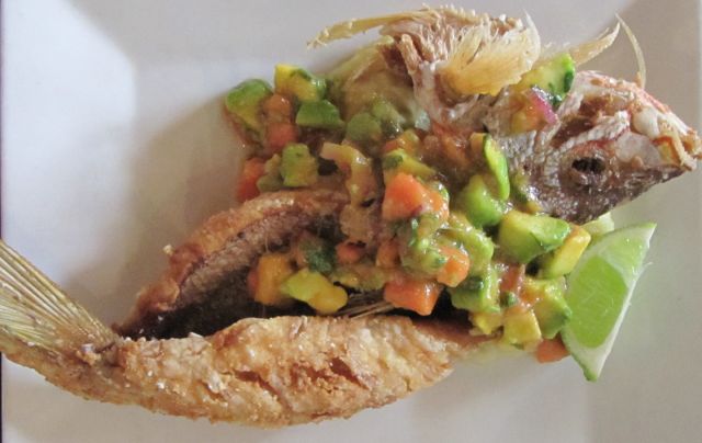 Moja glavna jed, tale riba (pink kožica in belo meso,) panirana je bila samo z notranje strani in kosti odstranjene tako mojstrsko, da ne vem, če sem mogoče našla dve koščici. Balansirala se je na malo krompirjevega pireja, čez pa neka salsa z avokadi. Pojedla tako hitro, da nisem imela časa za prehudo analizo.