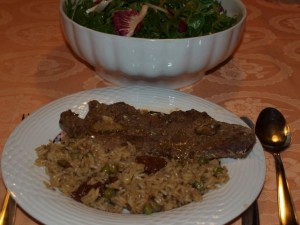 Goveja juhica; riž z grahom in suhimi paradižniki, goveji zrezki v jurčkovi omaki; motovilec, rukola, radič