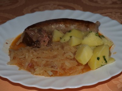 Kisla repa, krompir v kosih, pečenica