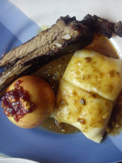 breskva"pižamar", sirovi štruklji, polnjena jabolka z brusnično marmelado in orehi, solata.