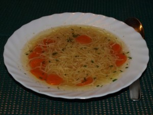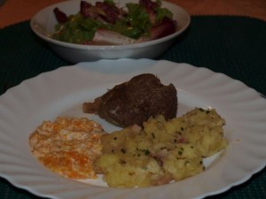 Goveja juhica z rezanci; pražen krompir, korenčkovo-hrenova omaka, govedina iz juhe; zelena solata z radičem: