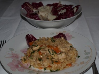 Danes pečena svinjina ter zelenjava na maslu in svaljki pa veliko raznovrstne solate.