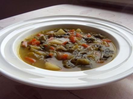 Zelenjavna mineštra s telečjim mesom. Hčerki pa pečenega piščanca in solato.