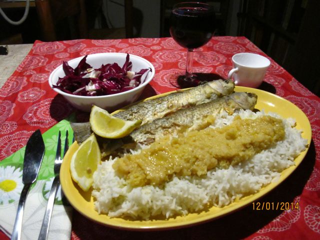 Mi smo bili danes v živalskem vrtu in bilo je super na sončku. Ker razen kostanja ni bilo moč nič popiti, pojesti, smo šli k Čadu na pleskavico, piščančji file na žaru, čevape, šobsko solato in pečene paprike, pa sladico tufahijo.Dobro, da se da naročit polovične porcije, ampak še to je bilo preveč.