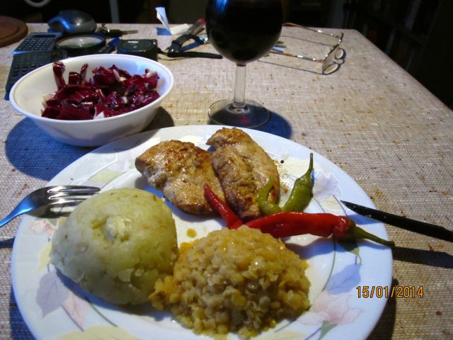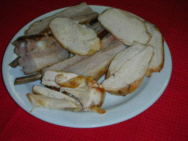 torej: marinirana piščančja prsa ( ne, ne, niso bila usmrajena, čeprav sem rahlo sumil da bodo, mariniranje je za vsak primer