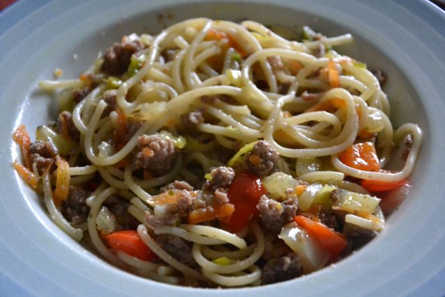 spodbeMoški del danes vztrajal pri steakh, pa sta dobila, kar sta iskala, ženski del sva pa jedli špagete z mletim mesom in zelenjavo; nič v omaki, le lepo prepečeno meso in potem dodana zelenjava, da je bila še kot sveža ...