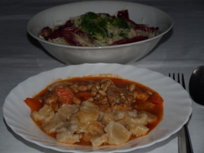 Pri nas pa danes goveja juha z rezanci, pečena vratovina in pečen krompir (oboje v pečici), endivija in radič s fižolom in česnom. Za sladico kot očitno mnogi danes - jabolčna pita.
