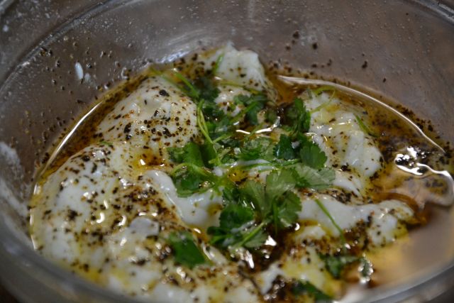 Enolončnici dodamo še gost jogurt, preko katerega zlijemo na ghiju prepražen čili in korinader