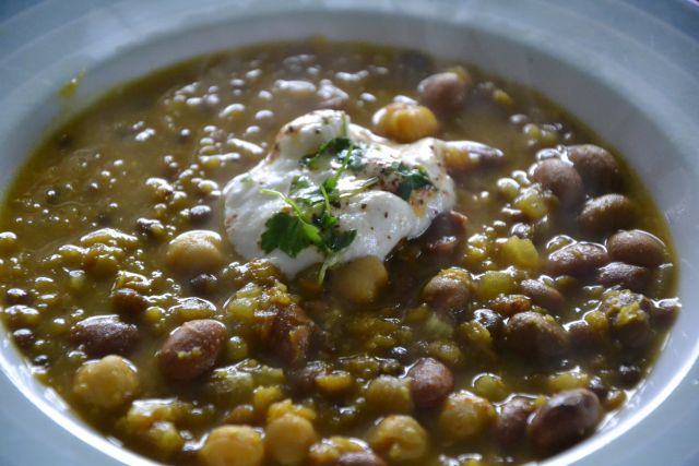 Jogurt s praženim čilijem in koriandrom je "šarf", a res lepo dopolni mešanico leče, čičerike in fižola (in vsega ostalega kar je v tej jedi, od čebule, česna, ingverja pa do palete suhih indijskih začimb ...)