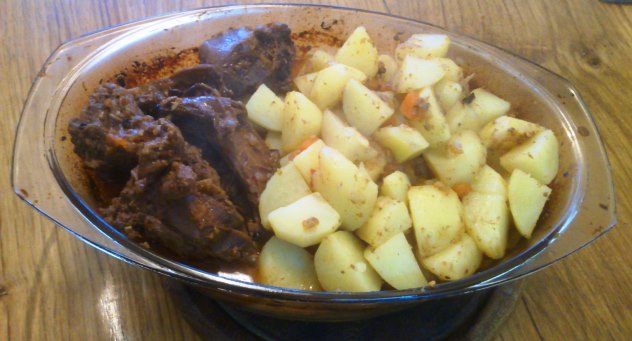 Aja, po tistem zajtrku s pohanim pišekom smo za kosilo "potamanili" steake pa pečen krmpir, solata in vino pa itak zraven sodita.