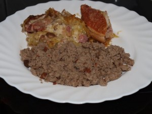 včeraj je bil pire in ohrovt v omaki in mini košček peč. puranjega zrezka, danes ostanek makaron flajša in solata.