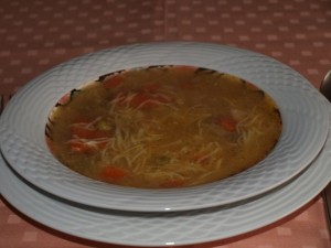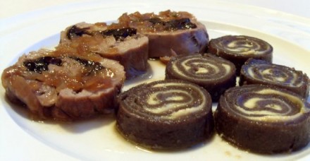 Za vsakega dve žlici zelenjavne mineštre, s slivami polnjena sv. ribica, ajdovi štruklji