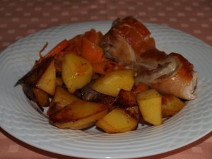 Goveja juhica zmešana z včerajšnjo "begovo čorbo"; pečen krompir, pečen odojek, v voku prepražen korenček; motovilec z radičem; jabolčna pita