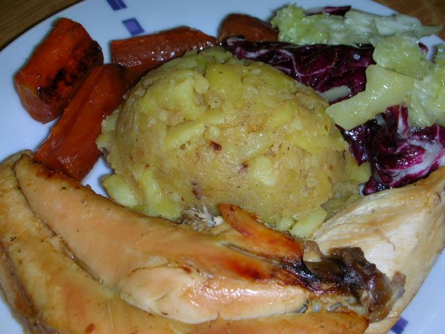 mzmDanes pa pečen piščanec, pire krompir in zelenjava na maslu..