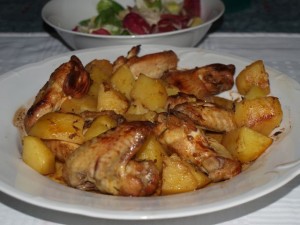 Piščančja juhica z jetrnimi cmoki; perutničke in krompir pečen v vrečki; zelje z zelenim in rdečim radičem