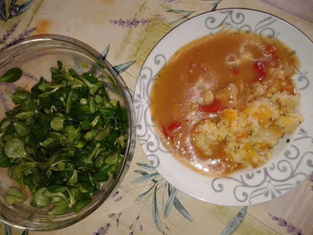 danes kuskus od včeraj, poleg pa piščančji file (koščki) s papriko v omaki in motovilc.