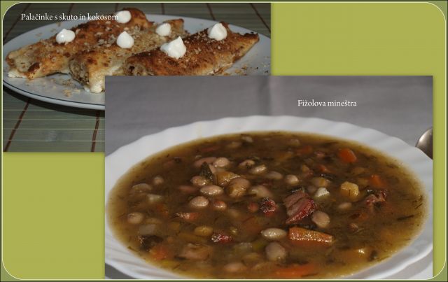 Fižolova mineštra, palačinke s skuto in kokosom