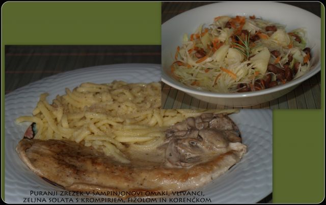 danica85Sobota: Puranji zrezek v smetanovi omaki s šampinjoni, vlivanci; zeljnata solata s krompirjem, fižolom in korenčkom: