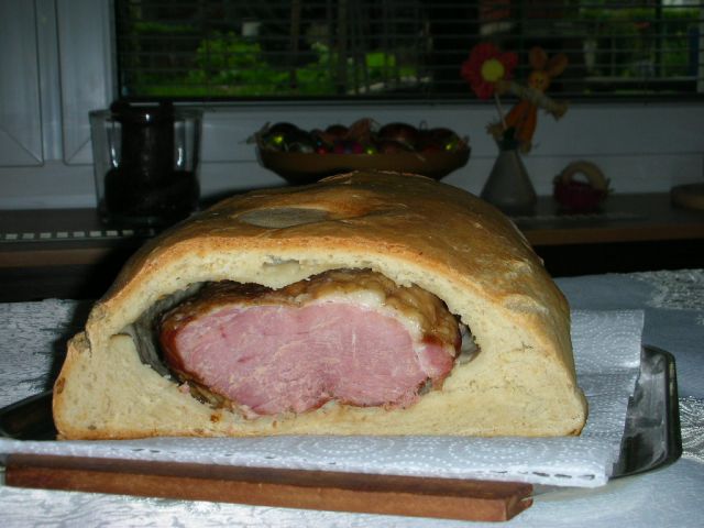 Pri nas pa velikonočno kosilo. Predjed: namaz iz skute, vodne kreše + dodatkov v paprikinem obročku in mlečna pletenička Glavna jed: šunka v testu, jajčne miške, hrenova omaka, skuta s čebulo in drobnjakom, mešana solata Sladica: profiteroli