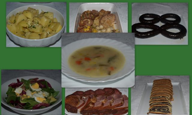 Juha, kuhane klobase, pražen krompir, kuhano kislo zelje, solata.