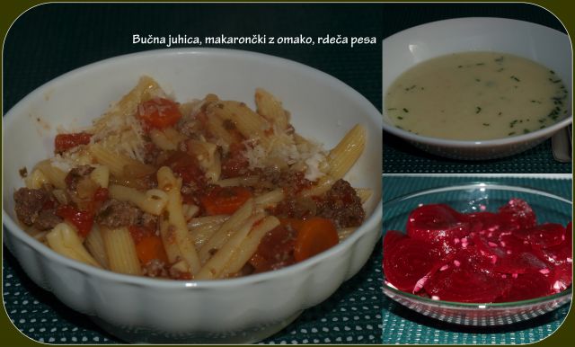 Ponedeljek: zelenjavna omaka, špagete, mesni sir in mešana solata (paradižnik, paprika, kumara)