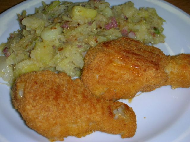 Ohrovt s krompirjem in pohane kračke.