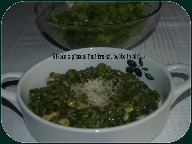 Rižota s piščančjimi trakci, bučko in zmečkano blitvo; zelena solata: