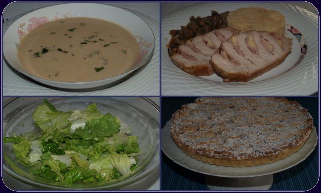 Kremna bučna juhica; kus-kus, šampinjoni v omaki, špikana sv. zarebrnica; solata - LL; slivova pita