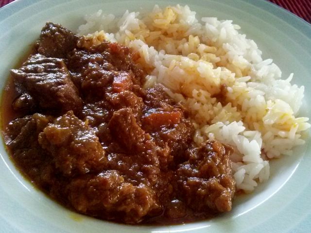 Kjer je volja, tam je pot. TrixiV soboto: curry z govedino po vietnamsko, meso se je z začimbami kuhalo v pivu, priloga bel riž: