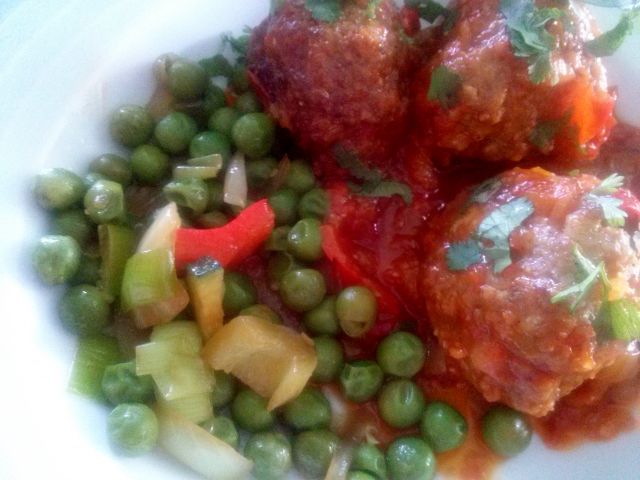 Danes pa mesne kroglice z navdihom orienta (beri s koriandrom, kuminom in še nekaterimi začimbami) v začinjeni paradižnikovi omaki, za prilogo mešana zelenjava, prepražena na olivnem olju: